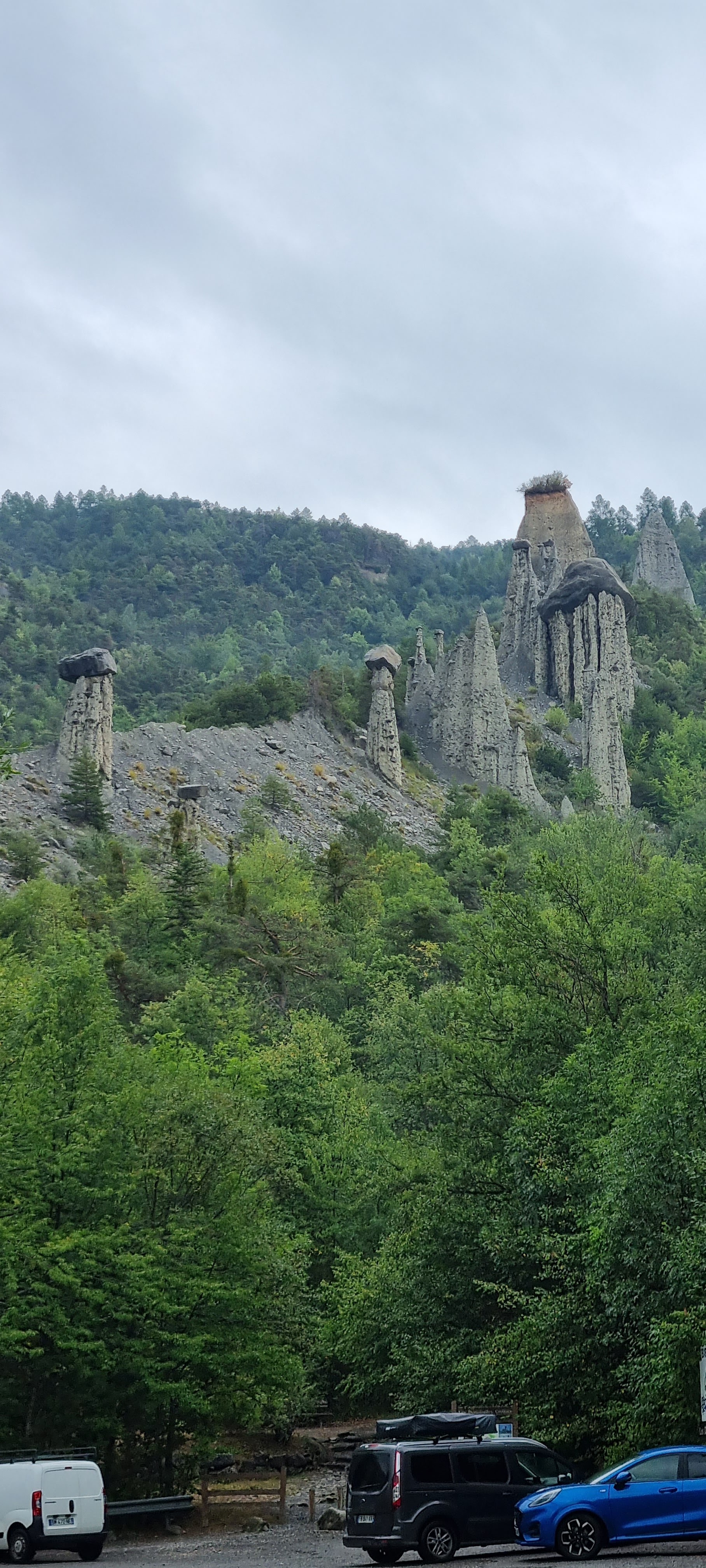 Jolie point de vue. Arrêt possible en voiture pour les voir de haut. Possible de se rapprocher avec 2 boucles de 5 min à pieds. 2 chaises longues en bois sur site permettent de contempler le panorama . Légende sur les demoiselles dansantes. Et explications géologiques sur le panneau.
